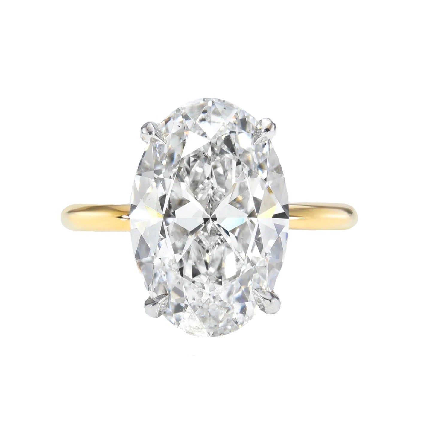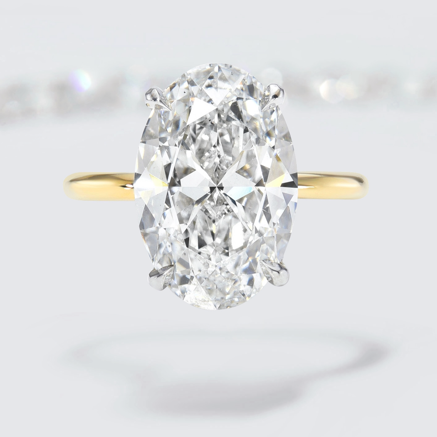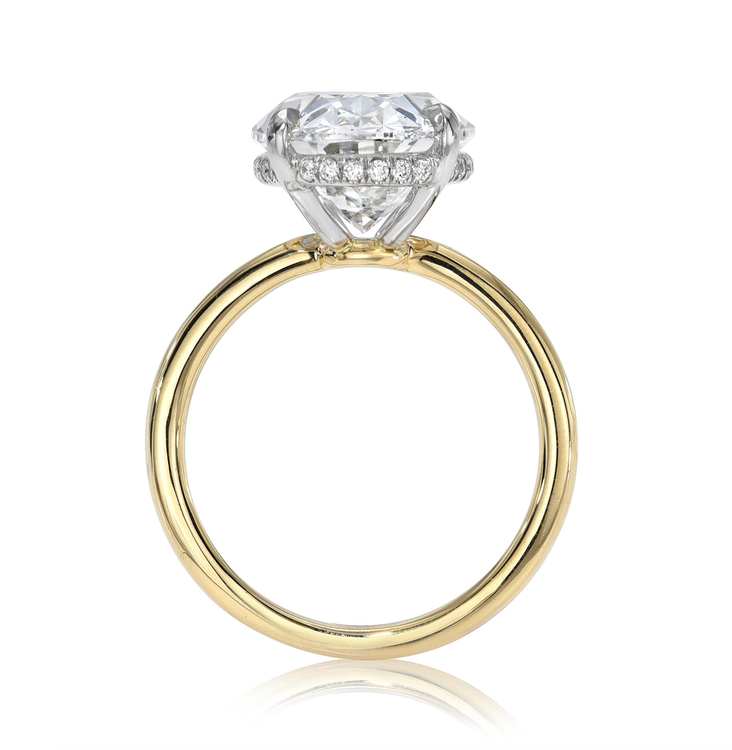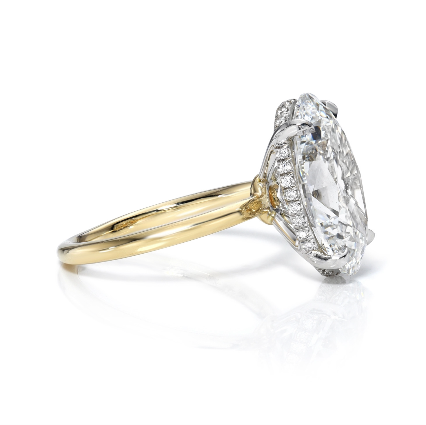 Pictured: Bespoke 4 carat Antique Oval Cut Diamond set with tiger claw prongs resting in a two-tone 18k white gold basket and 18k yellow gold shank. This timeless design features a sparkling Hidden Halo and an inset basket into shank for a lower profile. Starting at $10,000 for a 3 Carat Lab Grown Oval... see below.