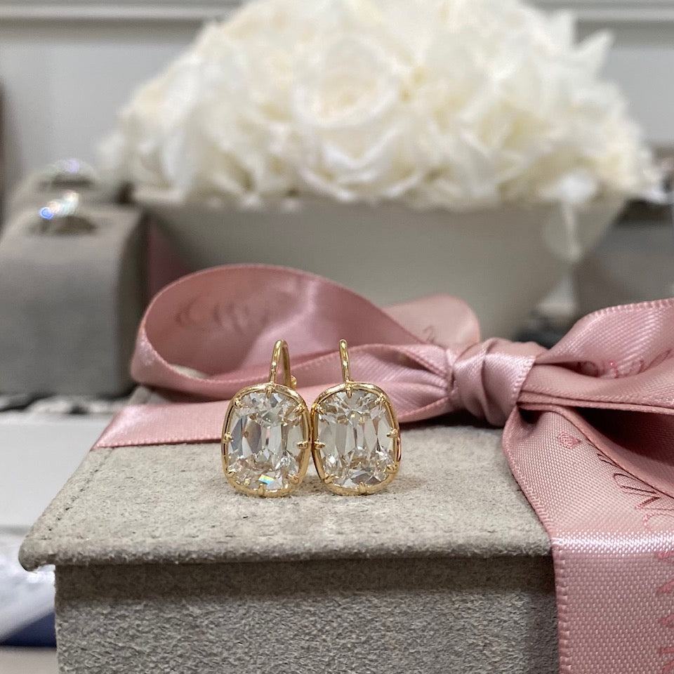 Available starting at 6 Carat total weight (3 carats in each ear). All sourced pairs are are E/F Color VS1 Clarity and uncertified antique cut cushions set in your choice of 14K White Gold, Yellow Gold, or Rose Gold.