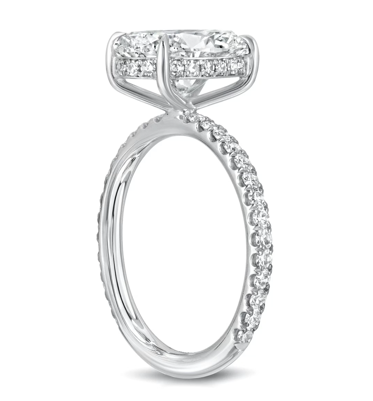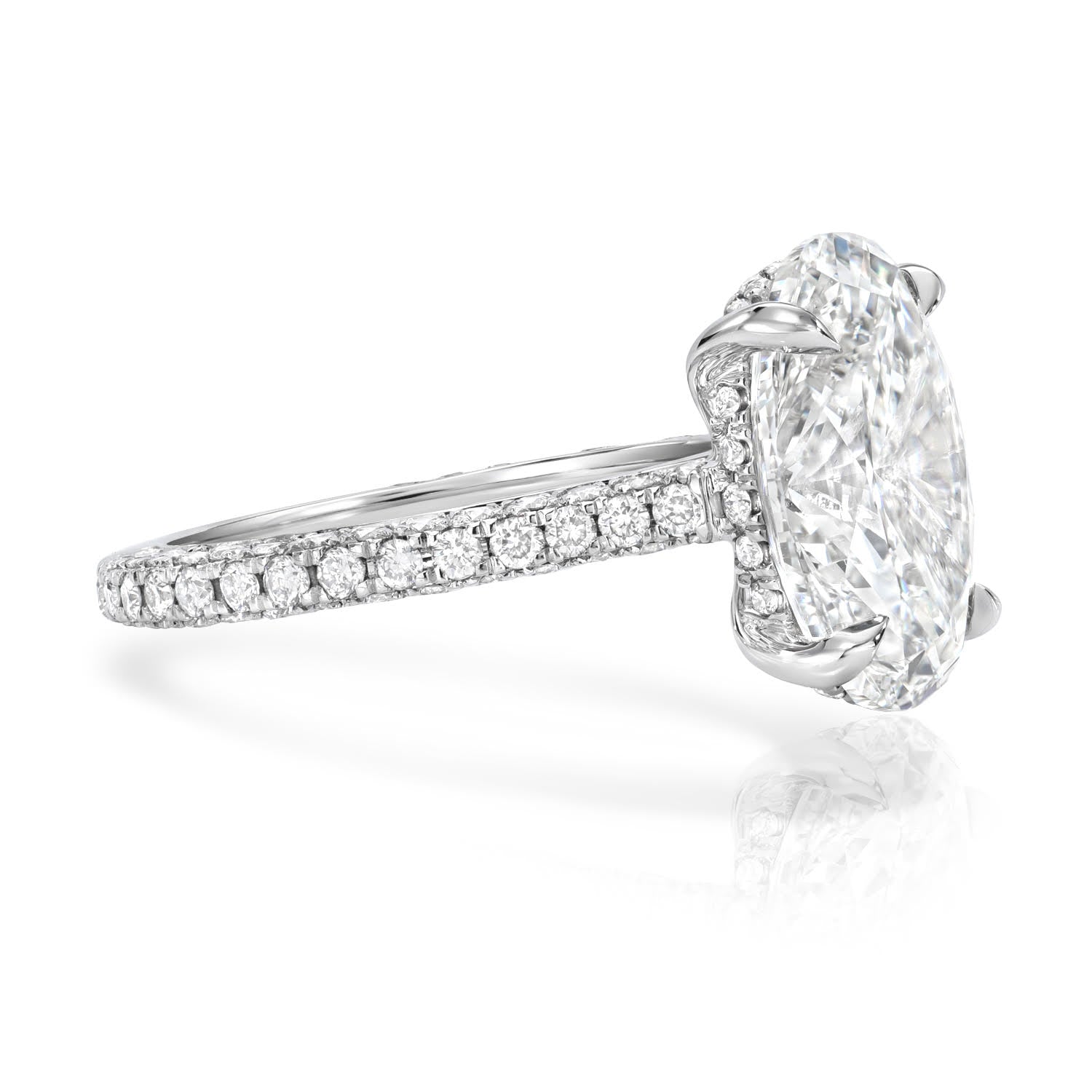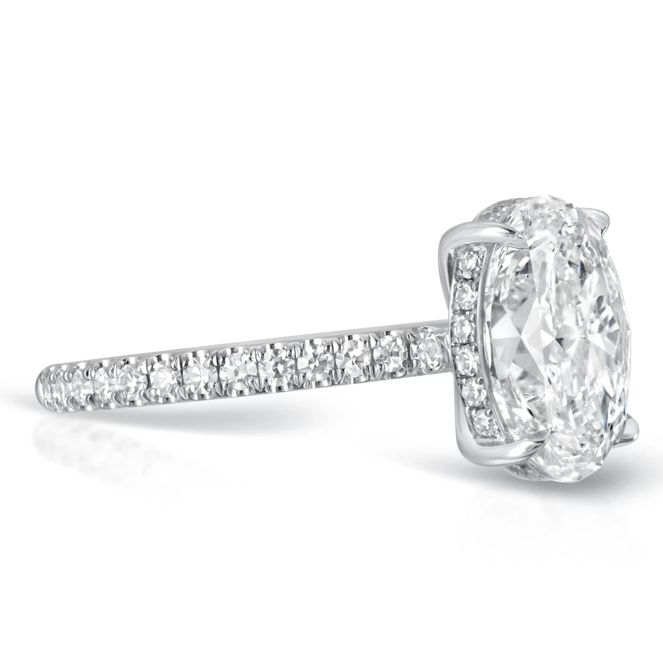 Make her shine with this Oval Brilliant Cut Diamond is set in a delicate tiger claw setting with a petite basket halo, handcrafted in Platinum. This design features a narrow Cathedral Style band with 3D Pave Set Accent Diamonds from every angle .