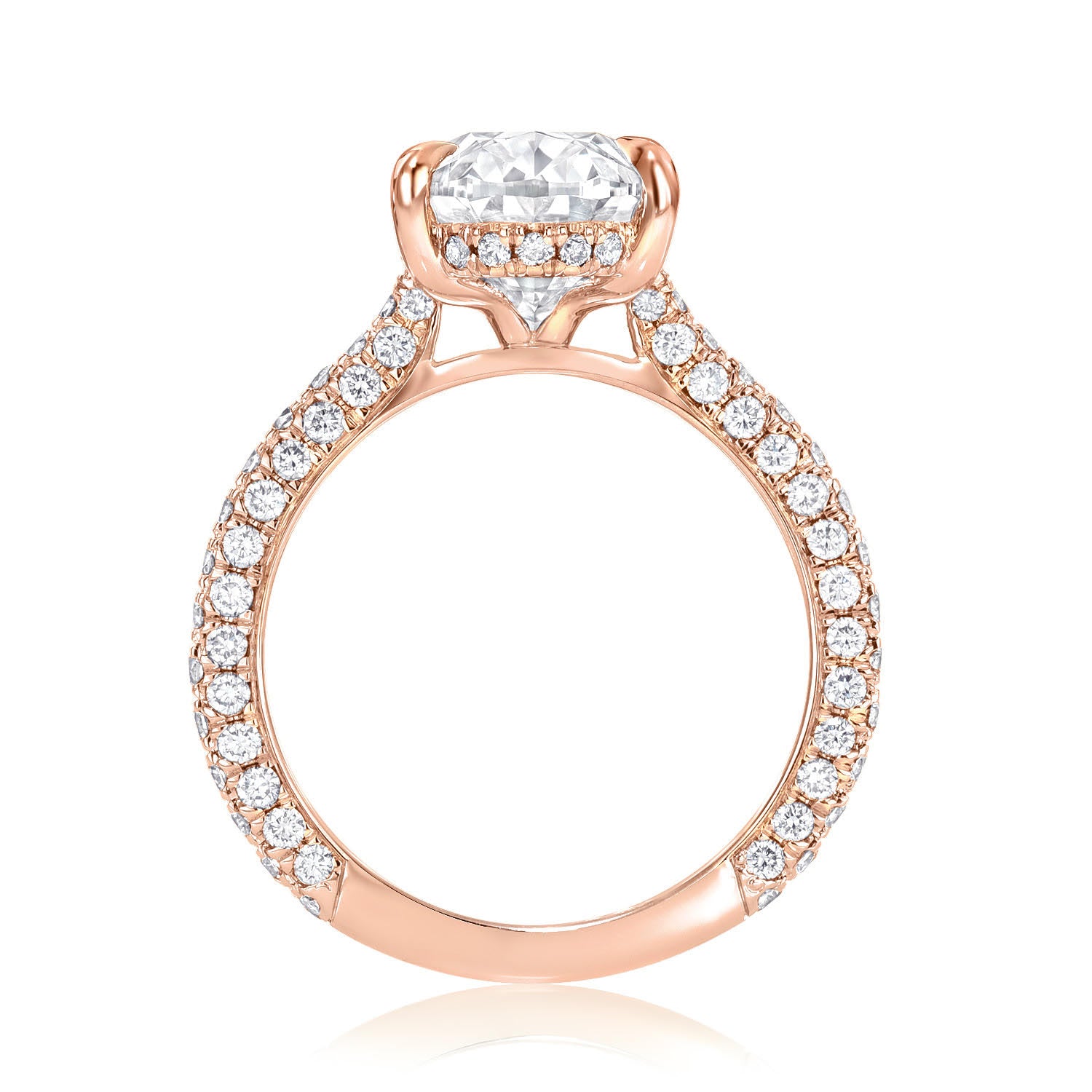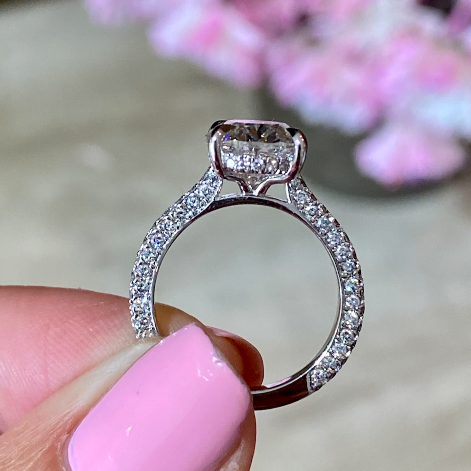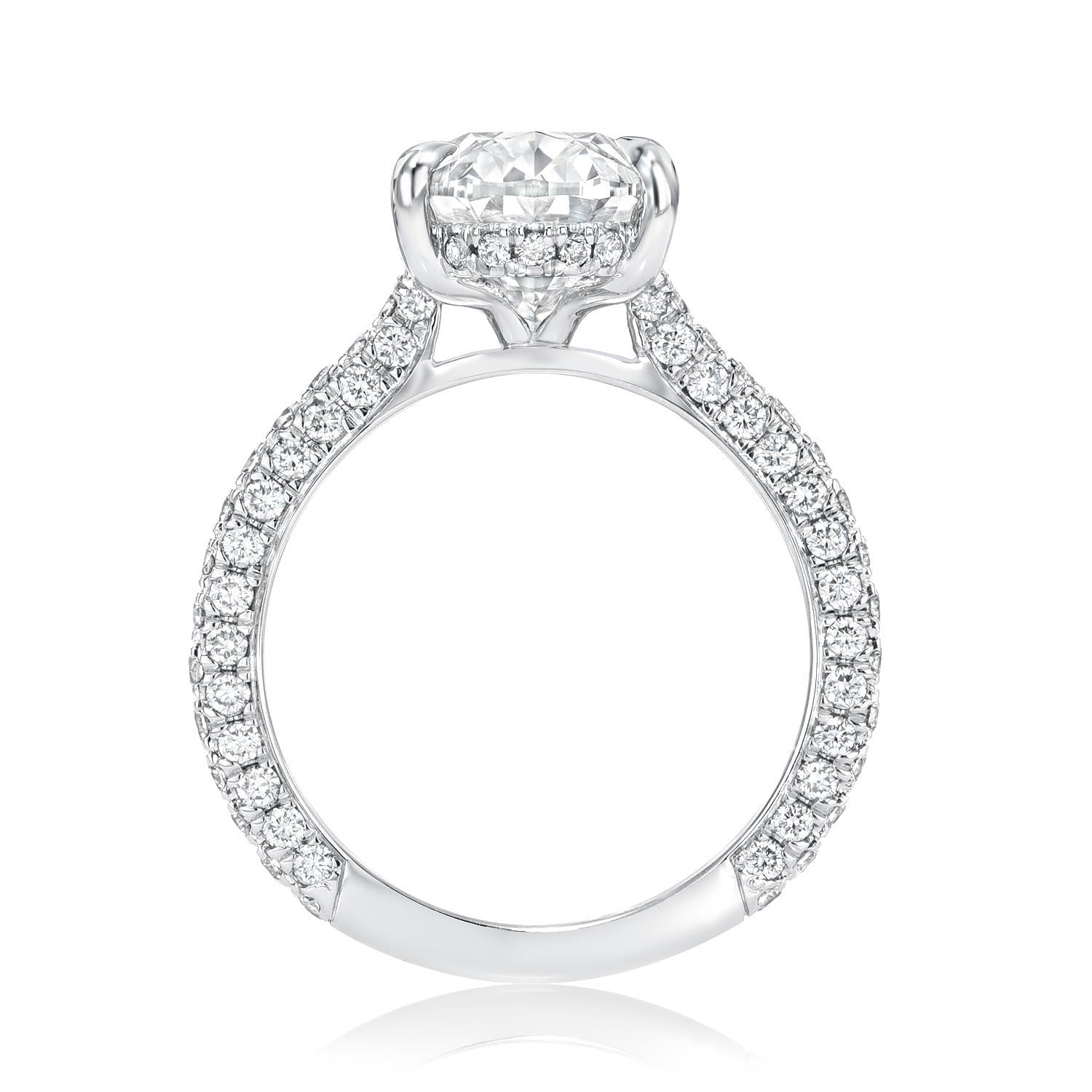 Make her shine with this Oval Brilliant Cut Diamond is set in a delicate tiger claw setting with a petite basket halo, handcrafted in Platinum. This design features a narrow Cathedral Style band with 3D Pave Set Accent Diamonds from every angle .