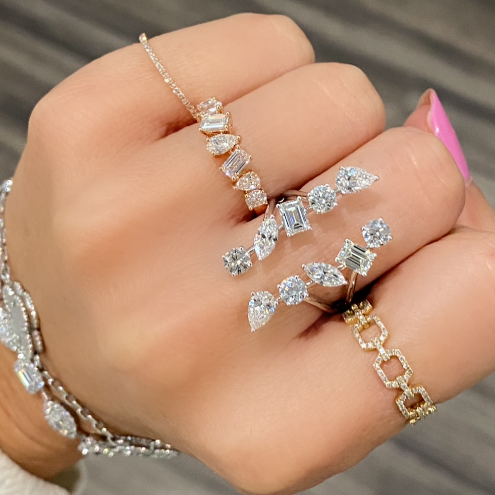 This bespoke 1 Carat Multi-Shape Diamond is available in your choice of Natural or Lab Grown Diamond. Natural Mined Diamonds are G/H Color, VS2 Clarity and set in your choice of 18K White Gold, Yellow Gold, or Rose Gold. Lab Grown Diamonds are F/G Color, VS1 Clarity set in your choice of 14K White Gold, Yellow Gold, or Rose Gold.