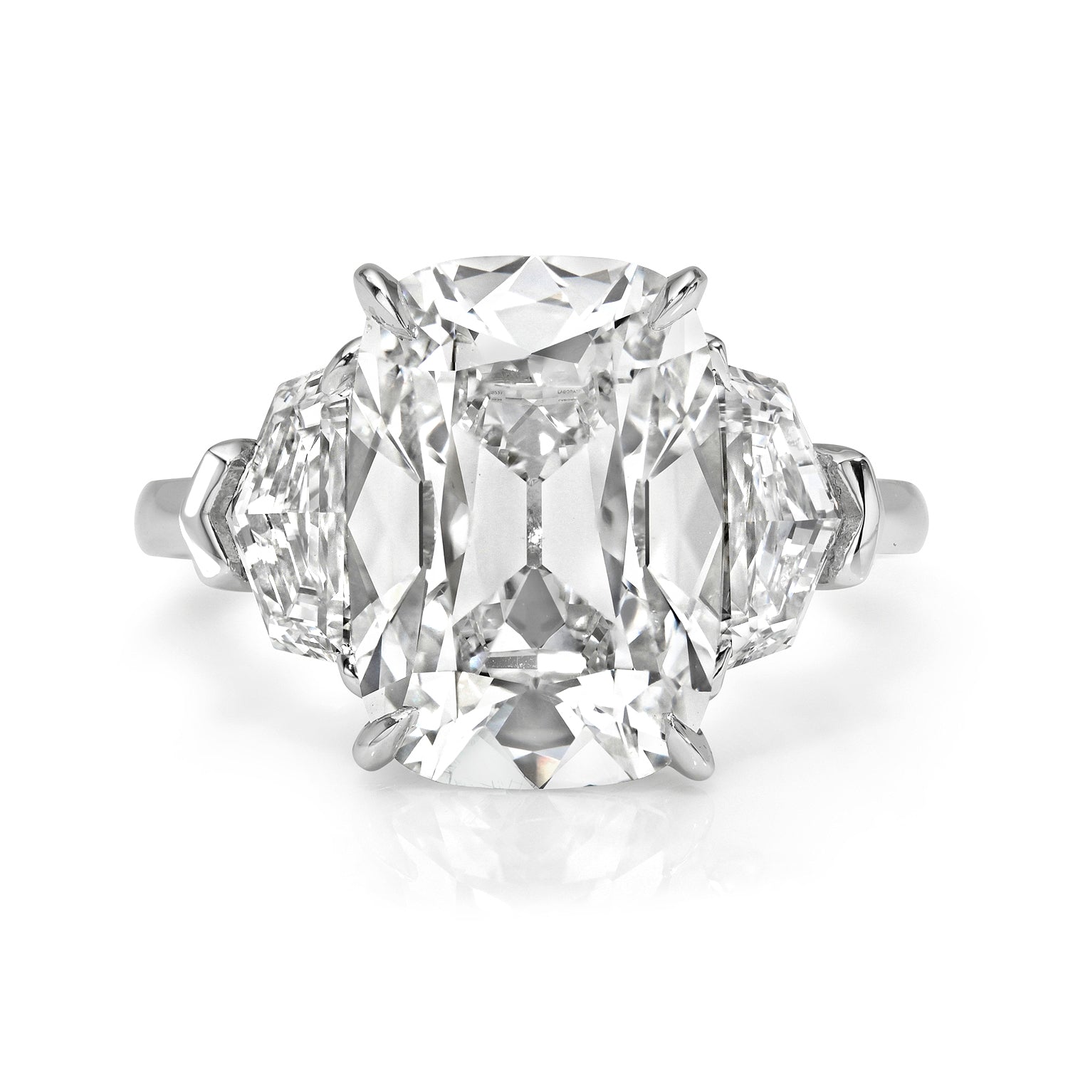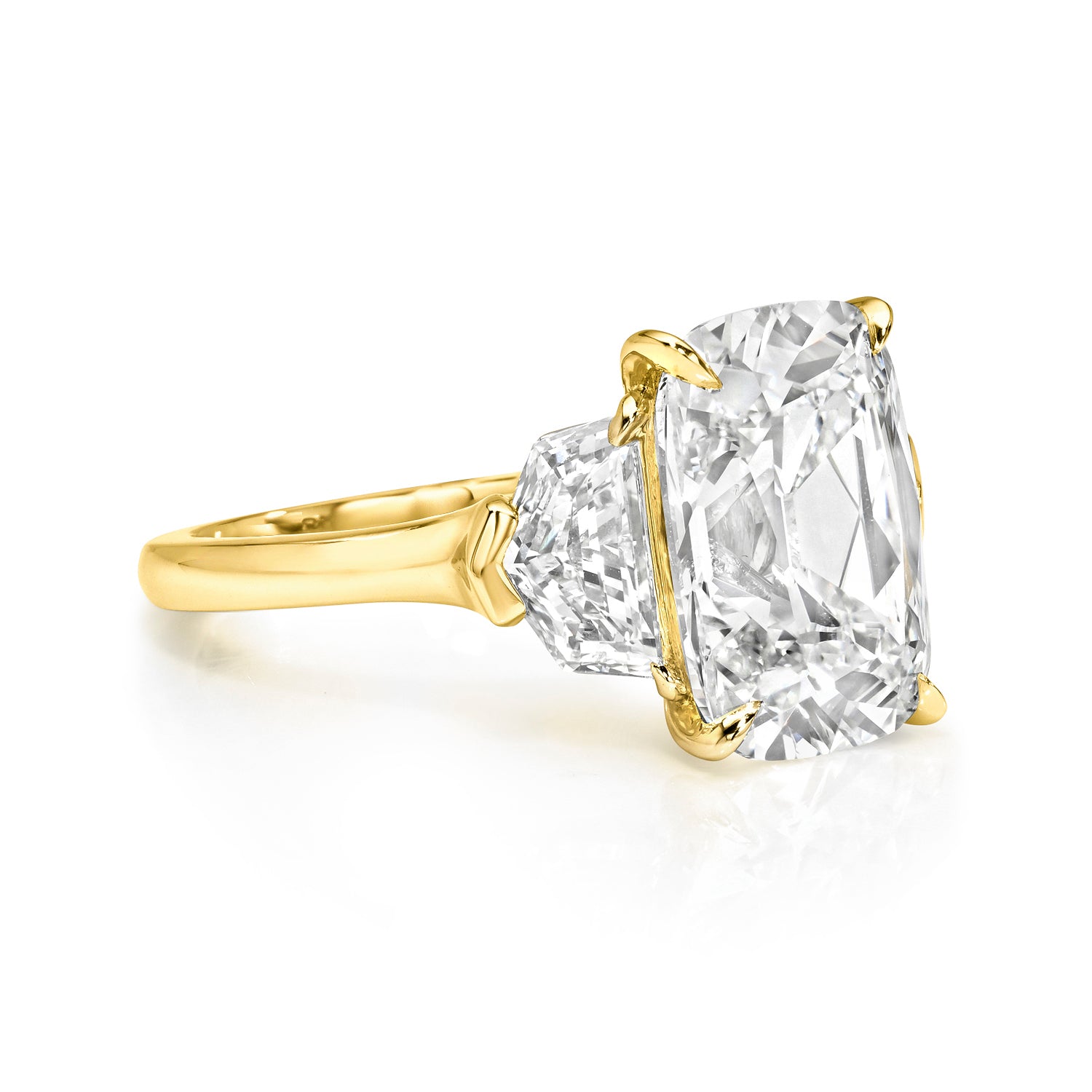 Timeless elegance meets artisanal craftsmanship in this heirloom-worthy three-stone ring. At its heart rests an Old Miner Antique Cushion cut diamond—a romantic cut beloved for its soft pillow shape, open facets, and warm, candlelight glow. Flanking the center stone are perfectly matched epaulette side diamonds, their angular geometry creating a graceful balance that frames the center diamond with refinement and strength.