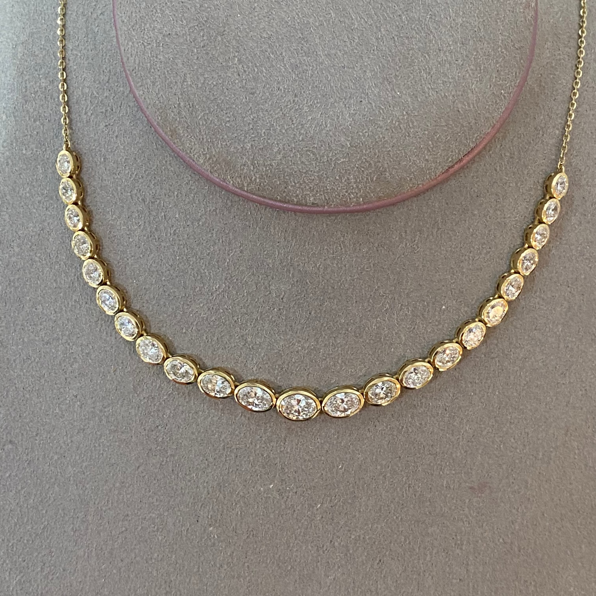 Each of the colorless, Lab Grown Diamond, totaling 4.7 carats, is individually set in a sleek, oval bezel. This unique setting style not only provides a clean, continuous line of sparkle, but also offers greater protection for each stone compared to traditional prong settings. The result is a necklace that’s both stunning and wearable, with a smooth design.
